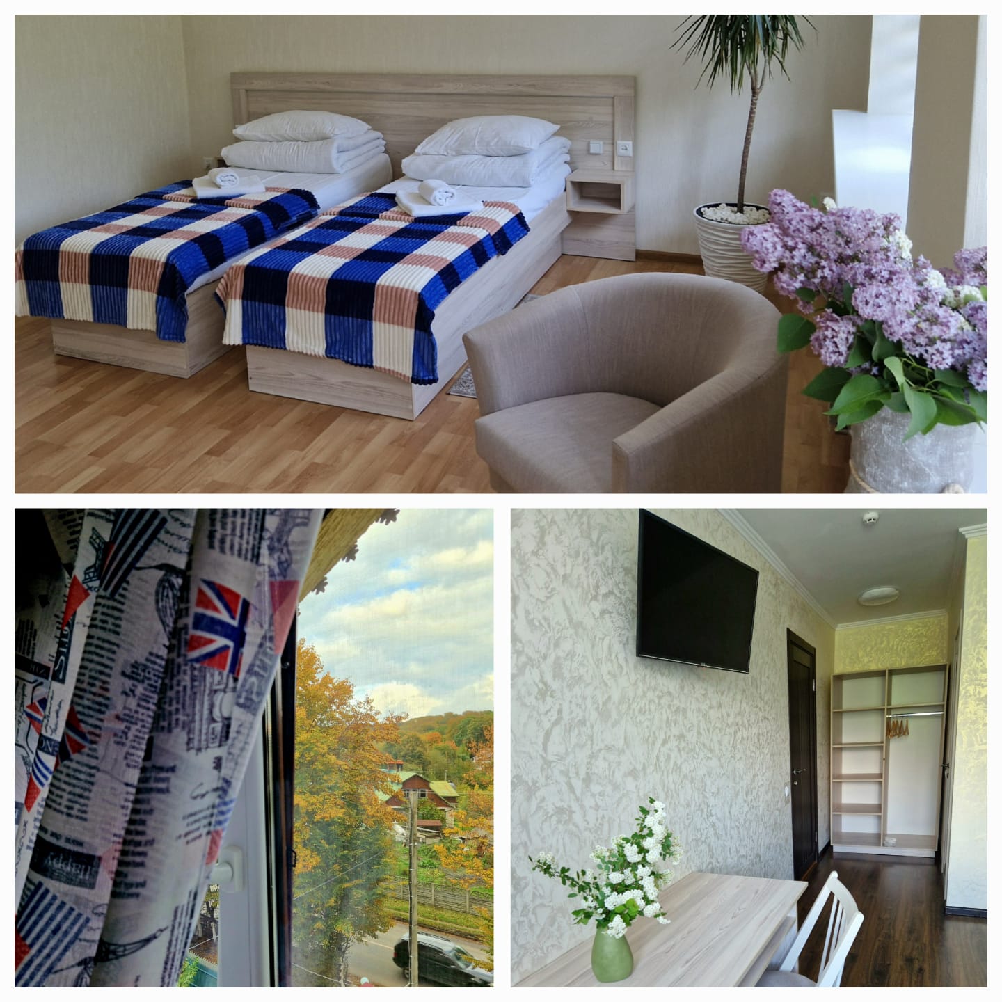 Просторий номер для відпочинку з близькими — комфортний і продуманий до деталей. Двоспальне ліжко 160×200, розкладний диван і затишний простір у кімнаті та на балконі. Власний санвузол із душем, рушниками, феном і базовими засобами гігієни. Кондиціонер, телевізор і Wi-Fi — для вашого комфорту. З балкона відкривається спокійний вид на сад і ліс.