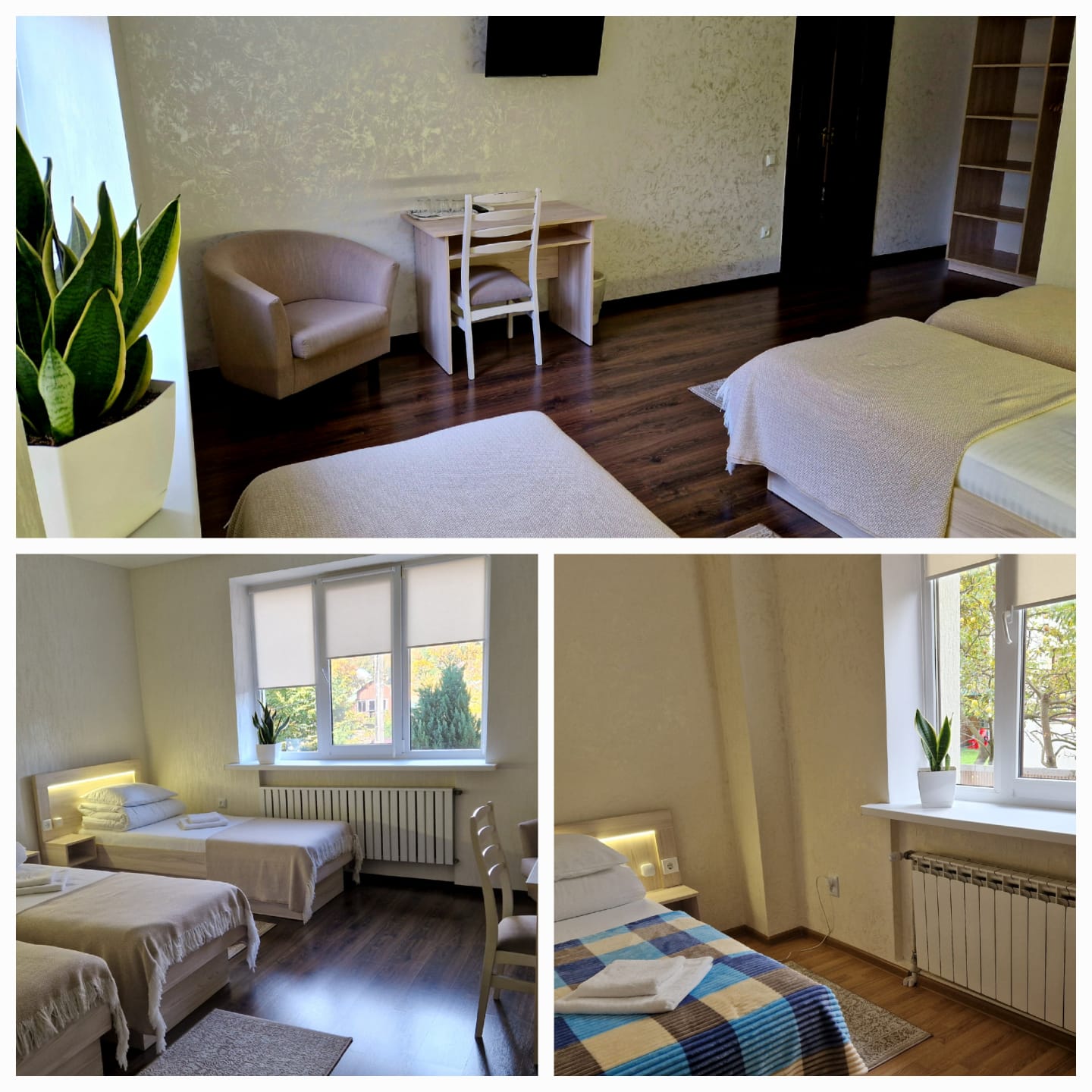 Комфортний номер для трьох гостей — ідеальний для друзів, сімей чи невеликої компанії. Три односпальні ліжка 80×200, які легко трансформуються у формат із двоспальним ліжком, та зручний простір для відпочинку. Власний санвузол із душем, рушниками, феном і базовими засобами гігієни. Кондиціонер, телевізор і Wi-Fi — для вашого комфорту.